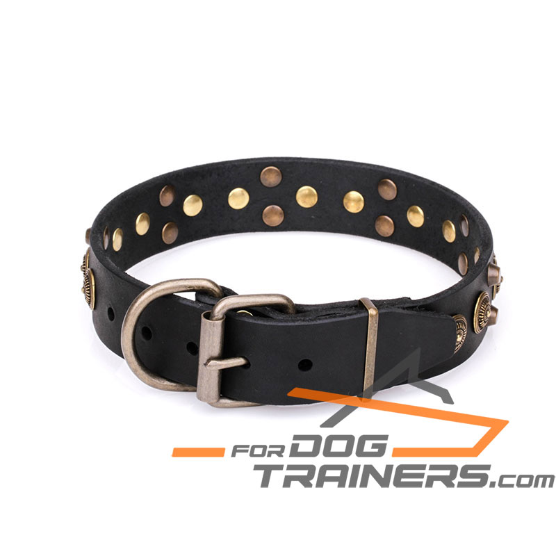 - The Collar is beautifully decorated with studs. There are two rows of brass plated pyramids and one row of large old bronze brooches. Such a combination makes the supply look unique and stylish as if it is a piece of jewelry.